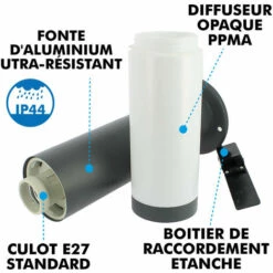 Cette borne de très belle conception possède un corps en aluminium et un diffuseur en polycarbonate (traité pour supporter les UV), cela en fait une borne de qualité est durable dans le temps.