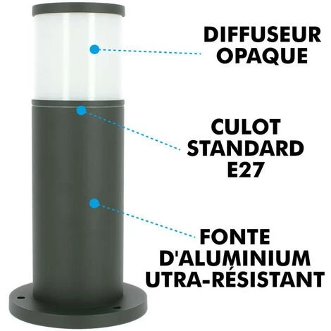 Par rapport a d’autre modèle de borne de jardin, ce modèle possède un diamètre plus important ce qui lui permet d’accepter des ampoules de plus forte puissance et plus grande dimensions. Toutes les ampoules type E27 A60 passe dans cette borne.