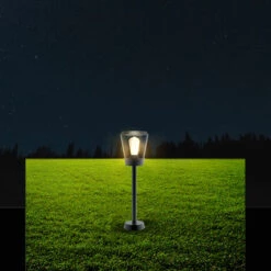 Ce potelet extérieur Haut 600mm est munit d’un culot E27. Nous recommandons l’installation d’une ampoule LED E27 à filament, design et contemporaine. En effet l’ampoule visible à travers le diffuseur transparent, contribue au design général du potelet. La finition gris mat apporte une touche sobre et raffinée. La structure est en aluminium et le diffuseur en PC robuste et durable. Ses dimensions sont les suivantes, hauteur 600mm et diamètre 175mm. L’indice de protection IP54 assure que le produit est :