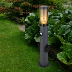 ETC-SHOP Borne Lumineuse Avec Prise Et Prise Détecteur De Mouvement Colonne Jardin Avec Lumière, Acier Inoxydable Anthracite, Fumée Plastique, 1x E27, DxH 7,6×60 Cm
