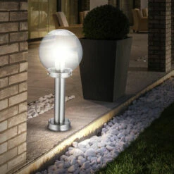 Description Lampe d’extérieur élégante qui met en valeur l’espace autour de votre maison avec style et classe. Gr&;ce à la classe de protection IP44, la lampe est résistante aux éclaboussures et donc prédestinée à une utilisation en extérieur, que ce soit sur la terrasse, le balcon ou dans le jardin. La douille E27 est fixée à un beau corps en acier inoxydable et est entourée d’une boule en verre transparent. Cela donne au luminaire une touche d’élégance. Par rapport aux luminaires normaux, les projecteurs à LED ne consomment qu’une quantité minimale d’électricité et consomment encore moins d’énergie. économiser les lumières. Cela protège l’environnement et votre portefeuille. Une source lumineuse LED de haute qualité et économe en énergie de 7 watts est incluse ! Détails