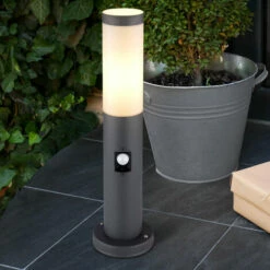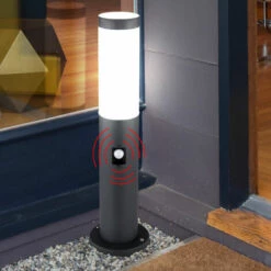 Description Cette élégante lampe sur pied se caractérise par son design élégant et sa grande finition. L’élégante lampe d’extérieur est idéale pour une utilisation en extérieur gr&;ce à son indice de protection IP44. Ce modèle est fabriqué en acier inoxydable de couleur anthracite et en plastique opale et a une hauteur totale de 45 cm. Equipée d’un détecteur de mouvement, cette lampe apporte une sécurité supplémentaire pour votre maison. En utilisant la télécommande fournie pour la lumière blanche et le contrôle RVB, le La lampe LED RVB peut être transformée en différentes couleurs. Par rapport aux lampes normales, les spots LED consomment une quantité minimale d’électricité et sont encore moins énergivores. économiser les lumières. Cela protège l’environnement et votre portefeuille. Une source lumineuse LED RVB de haute qualité et à économie d’énergie est incluse.</ div> Détails lampe • type de lampe : lampadaire• matériau : acier inoxydable, anthracite• abat-jour : plastique, opale• Détecteur de mouvement : 2- 8m, 90°</ div >• Classe de protection : IP44• Diamètre de la base en cm : 12,7• diamètre x hauteur en cm : 7, 6 x 45 • socket : 1x E27• Ampoules incluses : oui• ampoules : 1x 9 watts• flux lumineux : 1x 806 lumens• couleur de la lumière : blanc chaud• télécommande : uniquement pour la source lumineuse LED RVB• alimentation : 230V, 50Hz</ div> Détails de la source lumineuse • Type de source lumineuse : RGB-LED