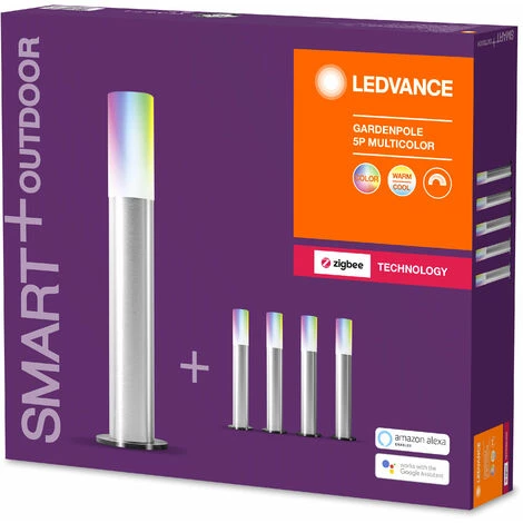 Bornes extérieures décoratives avec technologie ZigBee. Caractéristiques produit: Bornier 5 pôles facilement extensible avec un kit 3 pôles additionnel. Guirlandes lumineuses avec fonction d’éclairage intelligent sans fil intégrée. Contrôle des couleurs RVB, env. 16 millions d’options de couleurs réglables. Température de couleur réglable avec Tunable White : 2 000 à 6 500 K. Gradable. Indice de protection (pôle) : IP65. Indice de protection (alimentation): IP44. Protocole réseau : ZigBee. Durée de vie: jusqu’à 20,000 h. Contrôlable via le système smart home compatible (passerelle et application) ou via l’interrupteur SMART+ Switch. Pour une connexion complète, la connexion à un système smart home (passerelle et app) compatible est requis. Avantages produits: Facile à installer et à utiliser. Éclairage coloré de jardin avec des options de contrôle intelligentes. Utilise plusieurs couleurs ainsi que du blanc froid et chaud pour des scénarios d’éclairage flexibles. L’ensemble de base est extensible jusqu’à 11 pôles. Combine éclairage fonctionnel général et éclairage d’ambiance. Domaines d’application: Jardins, balcons et autres espaces extérieurs. Technique / Accessoires: Alimentation incluse uniquement dans le kit de base. Le contrôle via l’application nécessite un système LIGHTIFY (application et passerelle) ou tout autre système Smart home compatible..