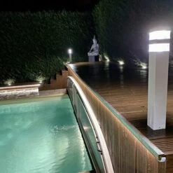Rappel : borne led exterieur lumineuse terrasse moderne lampe jardin finition inox potelet éclairage puissant design éclairage de pelouse chemin abords de piscine