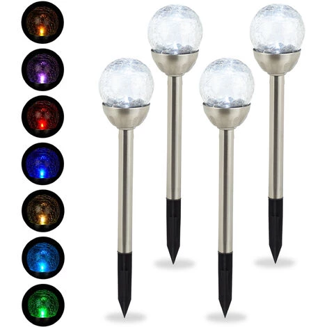Avec ces luminaires solaires en jeu de 4 apportez un éclairage enchanteur dans votre jardin. Les lampes de jardin LED sont simplement piquées au sol au moyen des piquets de terre fournis. Mettez les piquets de luminaires solaires là où vous avez de lumière solaire pendant le jour. Ainsi les luminaires LED sont dans l’intervalle de quelques heures chargées complètement pour après éclairer. Ces lumières de jardin font particulièrement sensation dans l’obscurité. Grâce à leur effet calcin les luminaires de jardin projettent un éclairage particulier. Utilisez les lampes de jardin LED résistant aux intempéries pour différentes occasions, telles que mariages ou barbecues et créez ainsi la véritable ambiance. Ces lampes servent aussi de marqueurs décoratifs pour les chemins.